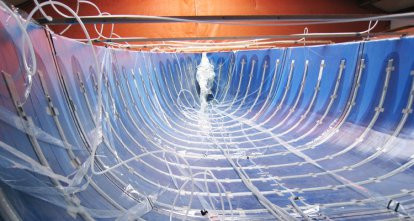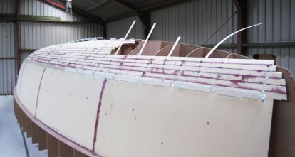 Nadat de buitenzijde is voorzien van gewapend hars, wordt het casco gekeerd. Vervolgens wordt het bouwframe verwijderd en wordt de binnenzijde voorzien van gewapend hars. In dit geval is gekozen voor epoxyhars met een glasweefsel wapening, aangebracht door middel van de vacuüm-injectie methode.
